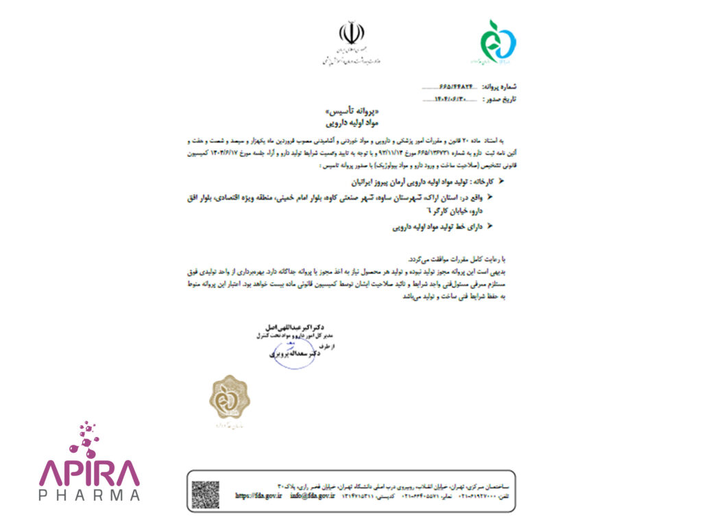 پروانه تأسیس کارخانه تولید مواد اولیه دارویی از سازمان غذا و دارو