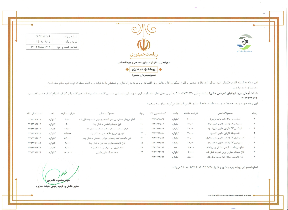 شرکت آپیرا فارما با افتخار اعلام میدارد که موفق به اخذ پروانه بهرهبرداری جدید از مراجع رسمی و ذیصلاح کشور شده است. این پروانه با مجوز صادره از ریاست جمهوری – شورای عالی مناطق آزاد تجاری، صنعتی و ویژه اقتصادی و پس از طی کامل فرآیندهای قانونی، فنی و نظارتی، برای فعالیتهای تولیدی این شرکت صادر گردیده است.