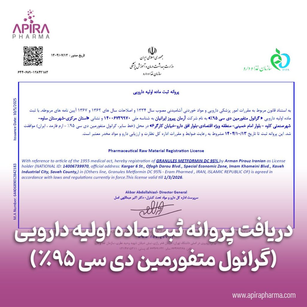 شرکت آپیرافارما مجوز جدید تولید ماده اولیه دارویی “گرانول متفورمین DC 95” را دریافت کرد